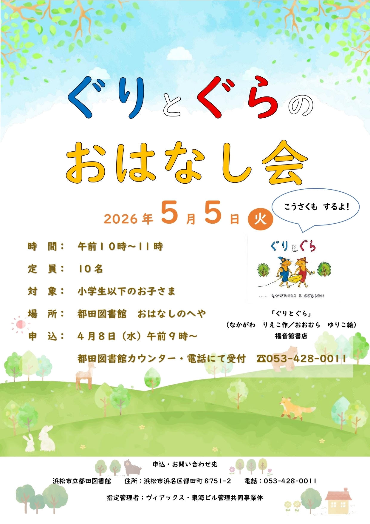 新着イベント ぐりとぐらのおはなし会 2026年5月5日 体験・ワークショップ 浜名区 浜松市立都田図書館 浜松市立都田図書館 おはなしのへや 体験・ワークショップ 浜名区 浜松市立都田図書館 事前申込み必要 都田図書館 子どもクラブ 2026年5月16日 体験・ワークショップ 浜名区 浜松市立都田図書館 浜松市立都田図書館 おはなしのへや 体験・ワークショップ 浜名区 浜松市立都田図書館 事前申込み必要 「浜松市ことばを育てる親の会」講演会 2026年6月6日 浜名区 サーラ音楽ホール 浜名区 事前申込み必要 はままつ歯と口の健康フェスタ2026 2026年6月7日 中央区 体験・ワークショップ クリエート浜松 中央区 体験・ワークショップ グランシップこどものくに~くるくるひらひら~&グランシップあおぞらマルシェ 2026年5月3日 〜 2026年5月5日 体験・ワークショップ マルシェ・フリマ 市外 静岡県コンベンションアーツセンター グランシップ 体験・ワークショップ マルシェ・フリマ 市外 紙コップでこいのぼりを作ろう 2026年4月28日 体験・ワークショップ 市外 PR Mooovi浜名湖 体験・ワークショップ 市外 PR GWお楽しみイベント2026 森のクイズラリーにちょうせん! 2026年5月3日 〜 2026年5月4日 浜名区 教室・セミナー 静岡県立森林公園 静岡県立森林公園バードピア浜北 浜名区 教室・セミナー 静岡県立森林公園 森っ子クラブ 日曜コース 2026年6月7日 浜名区 教室・セミナー 静岡県立森林公園 静岡県立森林公園バードピア浜北 浜名区 教室・セミナー 静岡県立森林公園 事前申込み必要 森っ子クラブ 月曜コース 2026年6月8日 浜名区 教室・セミナー 静岡県立森林公園 静岡県立森林公園バードピア浜北 浜名区 教室・セミナー 静岡県立森林公園 事前申込み必要 プラネタリウム「天竜浜名湖鉄道星空紀行」 2025年12月26日 〜 2026年5月31日 中央区 体験・ワークショップ 浜松科学館 浜松科学館 中央区 体験・ワークショップ 浜松科学館 ワークショップ「バネの力でぶっ飛びロケット」 2026年4月21日 〜 2026年5月3日 中央区 体験・ワークショップ 浜松科学館 浜松科学館 中央区 体験・ワークショップ 浜松科学館 さわる!常設展示ツアー 2026年4月29日 〜 2026年5月3日 中央区 体験・ワークショップ 浜松科学館 浜松科学館 中央区 体験・ワークショップ 浜松科学館 さわる!サイエンスショー 2026年4月29日 〜 2026年5月3日 中央区 体験・ワークショップ 浜松科学館 浜松科学館 中央区 体験・ワークショップ 浜松科学館 プラネタリウム「星空マルシェ」 2026年4月1日 〜 2026年7月17日 中央区 体験・ワークショップ 浜松科学館 浜松科学館 中央区 体験・ワークショップ 浜松科学館 手織りでミサンガ作り 2026年6月21日 中央区 体験・ワークショップ 浜松市西部清掃工場・えこはま 浜松市西部清掃工場・えこはま 中央区 体験・ワークショップ 浜松市西部清掃工場・えこはま 事前申込み必要 もっと見る RSS