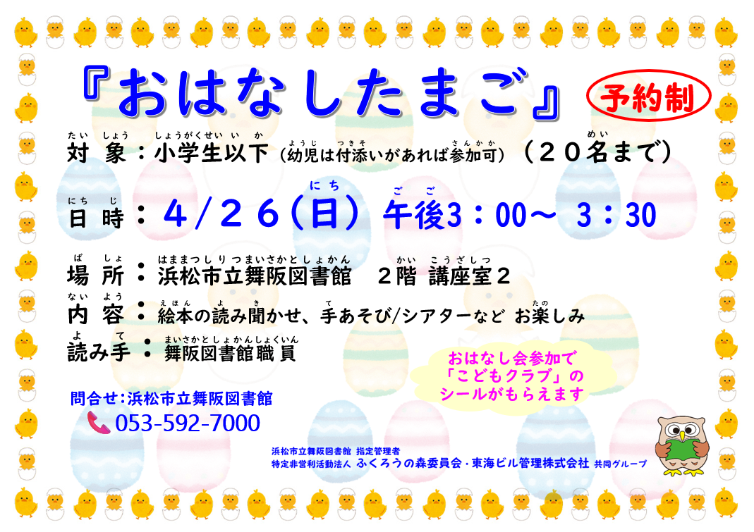今日のイベント 子育て支援ひろばの妊婦さんと家族のための講座 2026年4月4日 中央区 おひさま 教室・セミナー おひさま 中央区 おひさま 教室・セミナー 子育て支援ひろばの妊婦さんと家族のための講座 2026年4月4日 中央区 ころころルーム 教室・セミナー ころころルーム 中央区 ころころルーム 教室・セミナー 子育て支援ひろばの妊婦さんと家族のための講座 2026年4月4日 中央区 マイひろば 教室・セミナー マイひろば 中央区 マイひろば 教室・セミナー 子育て支援ひろばの妊婦さんと家族のための講座 2026年4月4日 まんまのつぼみ 中央区 教室・セミナー まんまのつぼみ まんまのつぼみ 中央区 教室・セミナー 子育て支援ひろばの妊婦さんと家族のための講座 2026年4月4日 わわわひろば 中央区 教室・セミナー わわわひろば わわわひろば 中央区 教室・セミナー 「みんなの水道・下水道絵画コンクール」の作品募集 2026年4月1日 〜 2026年6月19日 その他 その他 プラネタリウム「星空マルシェ」 2026年4月1日 〜 2026年7月17日 中央区 体験・ワークショップ 浜松科学館 浜松科学館 中央区 体験・ワークショップ 浜松科学館 プラネタリウム「天竜浜名湖鉄道星空紀行」 2025年12月26日 〜 2026年5月31日 中央区 体験・ワークショップ 浜松科学館 浜松科学館 中央区 体験・ワークショップ 浜松科学館 星空観望会 2026年4月4日 中央区 体験・ワークショップ 浜松市天文台 浜松市天文台 中央区 体験・ワークショップ 浜松市天文台 小展示「屏風や襖の下張文書からわかるもの」 2026年3月20日 〜 2026年5月24日 中央区 体験・ワークショップ 浜松市博物館 浜松市博物館 中央区 体験・ワークショップ 浜松市博物館 着付け初級講座 2026年4月4日 中央区 教室・セミナー 浜松市雄踏文化センター 中央区 教室・セミナー 浜名湖花フェスタ2026 2026年3月20日 〜 2026年6月7日 中央区 体験・ワークショップ はままつフラワーパーク はままつフラワーパーク 中央区 体験・ワークショップ はままつフラワーパーク フルーツパーク春の写生大会 2026年3月20日 〜 2026年4月5日 体験・ワークショップ 浜名区 フルーツパーク時之栖 浜松市フルーツパーク時之栖 体験・ワークショップ 浜名区 フルーツパーク時之栖 プレコンセプションケアについて動画で学ぼう 2026年3月5日 〜 2026年4月4日 中央区 その他 浜松市保健所 中央区 その他 「8020コンクール」参加者の募集 2026年4月1日 〜 2026年4月30日 体験・ワークショップ 浜松市歯科医師会会員のおよそ320カ所の歯科医院 体験・ワークショップ もっと見る RSS