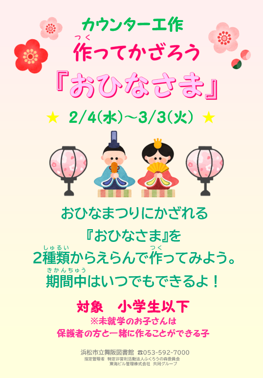 カウンター工作「作ってかざろう『おひなさま』」 2026年2月4日 〜 2026年3月3日 中央区 体験・ワークショップ 季節行事 浜松市立舞阪図書館 浜松市立舞阪図書館 中央区 体験・ワークショップ 季節行事 浜松市立舞阪図書館
