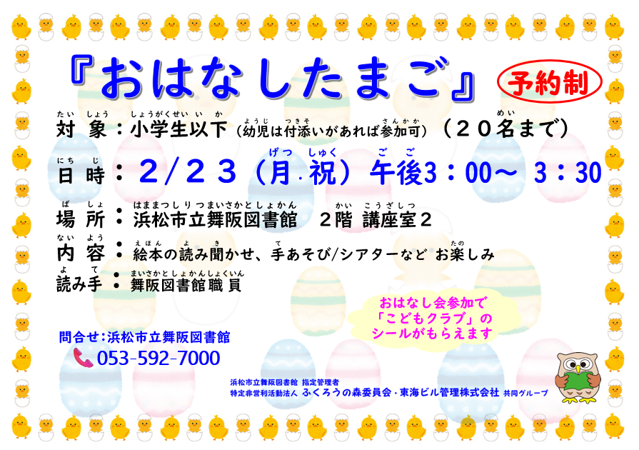 週末のイベント カウンター工作「作ってかざろう『おひなさま』」 2026年2月4日 〜 2026年3月3日 中央区 体験・ワークショップ 季節行事 浜松市立舞阪図書館 浜松市立舞阪図書館 中央区 体験・ワークショップ 季節行事 浜松市立舞阪図書館 子育て支援ひろばの妊婦さんと家族のための講座 2026年2月15日 中央区 ここみのおうち 教室・セミナー ここみのおうち 中央区 ここみのおうち 教室・セミナー 親子であそぼう「ははは広場」 2026年2月15日 中央区 ふれあい交流センター 浜松市ふれあい交流センター竜西 中央区 ふれあい交流センター ワークショップ「色変わりスライムをつくろう」 2026年2月10日 〜 2026年2月23日 中央区 体験・ワークショップ 浜松科学館 浜松科学館 中央区 体験・ワークショップ 浜松科学館 双眼鏡講座 2026年2月15日 中央区 体験・ワークショップ 浜松市天文台 浜松市天文台 中央区 体験・ワークショップ 浜松市天文台 からだのトリセツ~チャレンジ編~ 2026年2月15日 〜 2026年3月8日 中央区 ふれあい交流センター 浜松市ふれあい交流センター江之島 中央区 ふれあい交流センター 第3期カーズマン先生と楽しく体育遊び 2026年2月8日 〜 2026年3月22日 中央区 ふれあい交流センター 浜松市ふれあい交流センター江之島 中央区 ふれあい交流センター 里親制度説明会 2026年2月15日 浜名区 その他 浜名協働センター 浜名区 その他 こどもアドボカシーってなんだろう? 2026年2月15日 中央区 体験・ワークショップ 浜松こども館 浜松こども館 中央区 体験・ワークショップ 浜松こども館 しょうぎに挑戦 ~初心者から上級者まで~ 2026年2月14日 中央区 体験・ワークショップ 浜松こども館 浜松こども館 中央区 体験・ワークショップ 浜松こども館 おやつ作り~ ウインナーピザ~ 2026年2月15日 中央区 体験・ワークショップ 浜松こども館 浜松こども館 中央区 体験・ワークショップ 浜松こども館 事前申込み必要 はまきた食育の会 子ども食育フェスティバル 2026年2月15日 浜名区 教室・セミナー 浜名協働センター 浜名区 教室・セミナー こどものための読み聞かせ 2026年2月15日 浜名区 ふれあい交流センター 浜松市ふれあい交流センター浜北 浜名区 ふれあい交流センター 発泡ウレタンでスクイーズをつくろう 2026年2月14日 中央区 体験・ワークショップ 浜松科学館 浜松科学館 中央区 体験・ワークショップ 浜松科学館 浜松市動物園特別企画「動物と自然とわたしたち展」 2025年12月13日 〜 2026年2月23日 中央区 体験・ワークショップ 浜松市動物園 浜松市動物園 中央区 体験・ワークショップ 浜松市動物園 もっと見る RSS