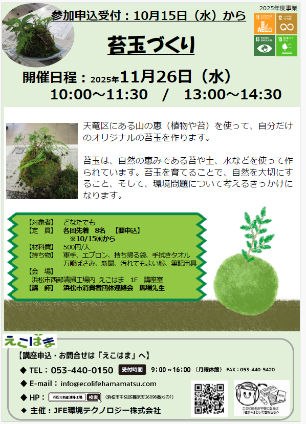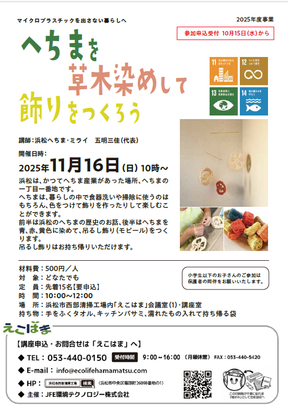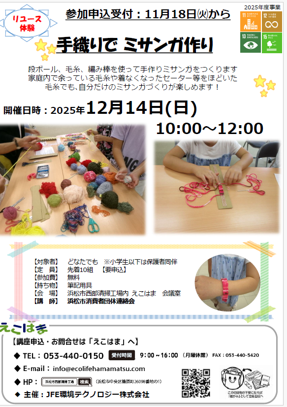 新着イベント 北遠秋まつり 2025年11月2日 〜 2025年11月16日 天竜区 季節行事 天竜区 季節行事 他人の土地を自分の場所のように使ってもらうためのあれこれ 2025年10月20日 〜 2025年12月22日 中央区 体験・ワークショップ ちまたパーク 中央区 体験・ワークショップ いろいろつくろう!表現しよう!シリーズ 「メキシコの死者の日を楽しもう!」by ラウラ・ロドリゲス(ビジュアルアーティスト) 2025年11月1日 中央区 体験・ワークショップ ちまたパーク 中央区 体験・ワークショップ いろいろつくろう!表現しよう!シリーズ (1)落書きワークショップ (2)ものものがたり 2025年10月18日 中央区 体験・ワークショップ ちまたパーク 中央区 体験・ワークショップ ちまたパーク妄想会議 2025年10月18日 中央区 体験・ワークショップ ちまたパーク 中央区 体験・ワークショップ あいホール 親と子で楽しむ秋のコンサート2025 2025年11月23日 中央区 文化芸術 あいホール (浜松市男女共同参画・文化芸術活動推進センター) 中央区 文化芸術 事前申込み必要 「みどり生活を愉しむ」講演会 2025年10月19日 中央区 教室・セミナー 地域情報センター 中央区 教室・セミナー 事前申込み必要 手織りでミサンガ作り 2025年12月14日 中央区 体験・ワークショップ 浜松市西部清掃工場・えこはま 中央区 体験・ワークショップ 苔玉作り 2025年11月26日 中央区 体験・ワークショップ 浜松市西部清掃工場・えこはま 中央区 体験・ワークショップ へちまを草木染めして飾りをつくろう 2025年11月16日 中央区 体験・ワークショップ 浜松市西部清掃工場・えこはま 中央区 体験・ワークショップ 紙パック(牛乳パック)から、はがきをつくろう! 2025年11月23日 中央区 体験・ワークショップ 浜松市西部清掃工場・えこはま 中央区 体験・ワークショップ 一般向け学習講座「被災地が日常を取り戻すために」 2025年11月22日 中央区 教室・セミナー 浜松市防災学習センター 浜松市防災学習センター 中央区 教室・セミナー 浜松市防災学習センター 事前申込み必要 佐久間親子ひろば 2025年10月21日 体験・ワークショップ 中山間地域親子ひろば 天竜区 佐久間支所 体験・ワークショップ 中山間地域親子ひろば 天竜区 折り紙講座「きのこ」 2025年10月15日 Luana(るあな) 中央区 体験・ワークショップ Luana(るあな) Luana(るあな) 中央区 体験・ワークショップ クラシックとポップスのコラボレーション 大人ジブリコンサート 2025年11月9日 文化芸術 ヤマハ発動機コミュニケーションプラザ 文化芸術 事前申込み必要 もっと見る RSS