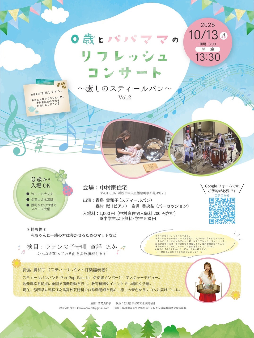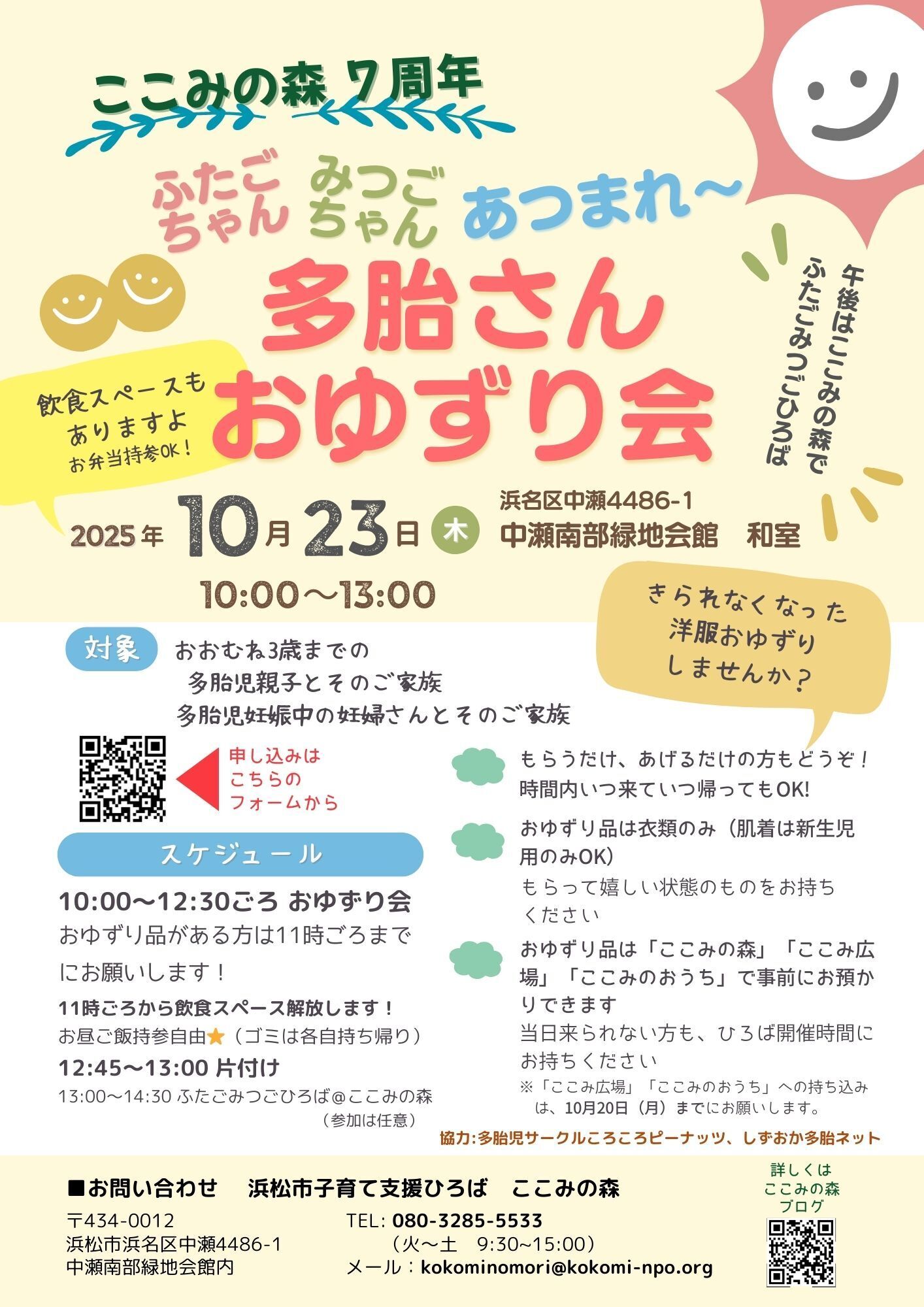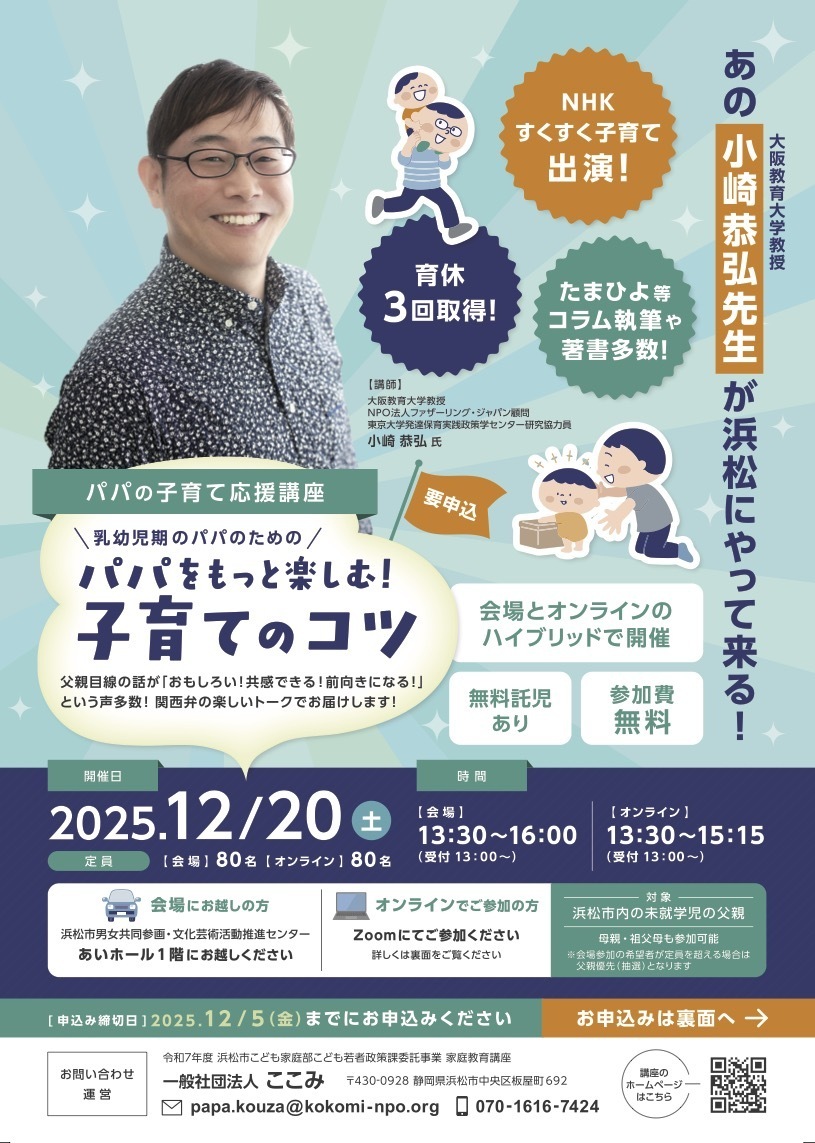 新着イベント 佐久間親子ひろば 2025年10月21日 体験・ワークショップ 中山間地域親子ひろば 天竜区 佐久間支所 体験・ワークショップ 中山間地域親子ひろば 天竜区 折り紙講座「きのこ」 2025年10月15日 Luana(るあな) 中央区 体験・ワークショップ Luana(るあな) Luana(るあな) 中央区 体験・ワークショップ クラシックとポップスのコラボレーション 大人ジブリコンサート 2025年11月9日 文化芸術 ヤマハ発動機コミュニケーションプラザ 文化芸術 事前申込み必要 浜松学院大学2025公開講座 2025年11月8日 中央区 教室・セミナー 浜松学院大学 体育館2階 中央区 教室・セミナー 事前申込み必要 多胎さんおゆずり会 2025年10月23日 浜名区 ここみの森 マルシェ・フリマ ここみの森 浜名区 ここみの森 マルシェ・フリマ 第30回 新居町産業まつり「あらいじゃん」 2025年10月26日 マルシェ・フリマ 市外 新居町の新居関所周辺 マルシェ・フリマ 市外 0歳とパパママのリフレッシュコンサート〜癒しのスティールパン〜vol.2 2025年10月13日 中央区 文化芸術 中村家住宅 中央区 文化芸術 事前申込み必要 おでかけひろば@城北の家 2025年11月5日 中央区 体験・ワークショップ 社会福祉法人天竜厚生会 城北の家 中央区 体験・ワークショップ 乳幼児期のパパのためのパパをもっと楽しむ子育てのコツ 2025年12月20日 中央区 浜松市男女共同参画・文化芸術活動推進センターあいホール 中央区 事前申込み必要 天竜川・浜名湖地域12市町村合併20周年記念事業 「みんなで歌う・踊る・つなぐ 遠州ええじゃないか祭り」 2025年10月19日 浜名区 マルシェ・フリマ なゆた浜北 駅前広場 浜名区 マルシェ・フリマ 天竜川・浜名湖地域12市町村合併20周年記念事業 「みんなで歌う・踊る・つなぐ 遠州ええじゃないか祭り」 2025年10月12日 中央区 マルシェ・フリマ 浜松市舞阪支所 駐車場 中央区 マルシェ・フリマ エアフェスタ浜松2025 2025年10月26日 中央区 体験・ワークショップ 航空自衛隊浜松広報館エアパーク 航空自衛隊浜松基地 中央区 体験・ワークショップ 航空自衛隊浜松広報館エアパーク 浜松市民フォトコンテスト 2025年8月20日 〜 2025年10月15日 体験・ワークショップ 体験・ワークショップ アレルギーについて知ろう!話そう!つながろう! 2026年1月17日 中央区 その他 浜松市子育て情報センター 浜松市子育て情報センター 中央区 その他 浜松市子育て情報センター はままつかいご探検隊2025 (第2回) 2025年11月1日 中央区 体験・ワークショップ 集合場所 アクトシティ南バス乗り場 中央区 体験・ワークショップ もっと見る RSS
