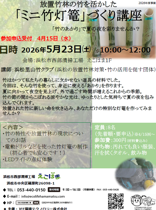 ミニ竹灯篭(たけとうろう)を作ろう 2026年5月23日 中央区 体験・ワークショップ 浜松市西部清掃工場・えこはま 浜松市西部清掃工場・えこはま 中央区 体験・ワークショップ 浜松市西部清掃工場・えこはま 事前申込み必要
