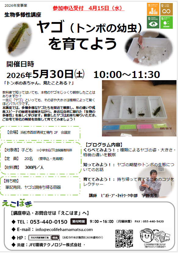 生物多様性講座 「ヤゴ(トンボの幼虫)を育ててみよう」 2026年5月30日 中央区 体験・ワークショップ 浜松市西部清掃工場・えこはま 浜松市西部清掃工場・えこはま 中央区 体験・ワークショップ 浜松市西部清掃工場・えこはま 事前申込み必要
