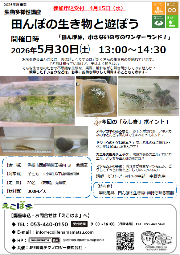 生物多様性講座 「田んぼの生きものと遊ぼう」 2026年5月30日 中央区 体験・ワークショップ 浜松市西部清掃工場・えこはま 浜松市西部清掃工場・えこはま 中央区 体験・ワークショップ 浜松市西部清掃工場・えこはま 事前申込み必要