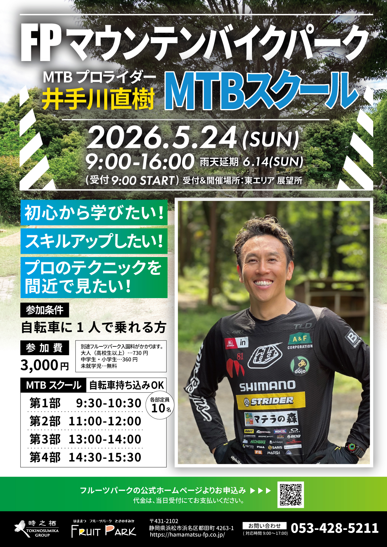 プロライダー井手川直樹によるMTBスクール 2026年5月24日 体験・ワークショップ 浜名区 フルーツパーク時之栖 浜松市フルーツパーク時之栖 体験・ワークショップ 浜名区 フルーツパーク時之栖 事前申込み必要