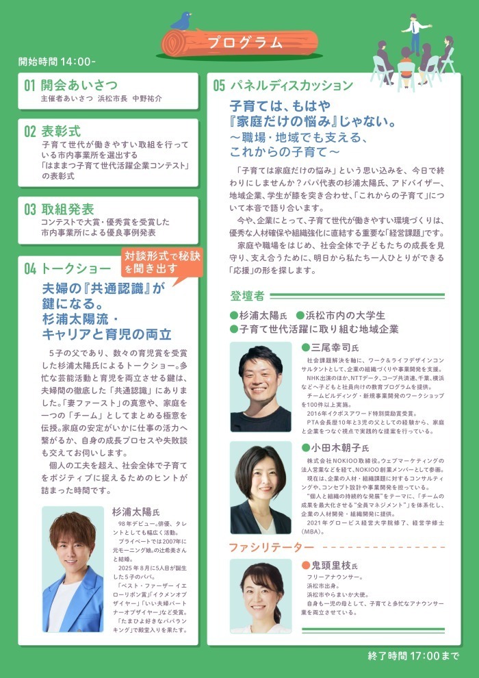 子育て世代の活躍を促進!杉浦太陽氏と一緒に、仕事と子育ての両立や子育て世代が働きやすい環境づくりに向けたヒントを学ぼう! 杉浦太陽氏をスペシャルゲストに迎えた「子育て世代 応援フォーラム」を開催します。 5子の父である杉浦流の「家庭をチームにする極意」や、地域企業による働きやすい環境づくりの事例など、仕事と育児を両立させるヒントが満載です。 【プログラム 】 ・開会あいさつ ・表彰式 子育て世代が働きやすい取組を行っている市内事業所を選出する「はままつ子育て世代活躍企業コンテスト」の表彰式 ・取組発表 コンテストで大賞・優秀賞を受賞した市内事業所による具体的な優良事例発表 ・トークショー 数々の育児賞を受賞してきた杉浦太陽氏が登壇。多忙な芸能活動と育児を両立させるための「夫婦の共通認識」や「妻ファースト」の真意など、家庭を一つのチームとしてまとめる極意を語ります。 ・パネルディスカッション 杉浦太陽氏に加え、アドバイザー、地域企業、学生が登壇。「これからの子育て」について、職場や地域の視点を交えて本音で語り合います。 |