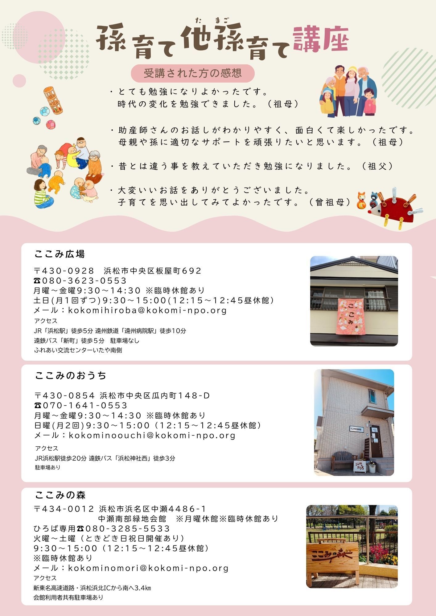 | 問い合わせ先 | 080-3623-0553 kokomihiroba@kokomi-npo.org フォーム |