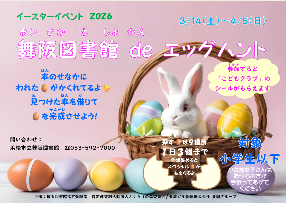 イースターイベント 2026 「舞阪図書館 de エッグハント」 2026年3月14日 〜 2026年4月5日 中央区 体験・ワークショップ 浜松市立舞阪図書館 浜松市立舞阪図書館 中央区 体験・ワークショップ 浜松市立舞阪図書館
