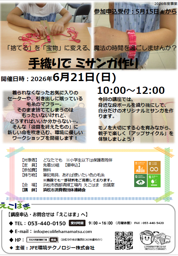 手織りでミサンガ作り 2026年6月21日 中央区 体験・ワークショップ 浜松市西部清掃工場・えこはま 浜松市西部清掃工場・えこはま 中央区 体験・ワークショップ 浜松市西部清掃工場・えこはま 事前申込み必要