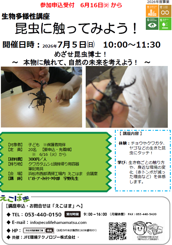 生物多様性講座 「昆虫にさわってみよう!」 2026年7月5日 中央区 体験・ワークショップ 浜松市西部清掃工場・えこはま 浜松市西部清掃工場・えこはま 中央区 体験・ワークショップ 浜松市西部清掃工場・えこはま